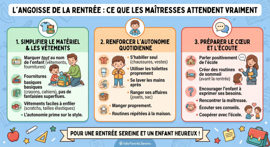 C’est le moment de relâcher la pression ! Oubliez le bourrage de crâne. Dans une classe de maternelle, l’enseignant et l’ATSEM doivent gĂ©rer entre 25 et 30 enfants simultanĂ©ment. Ce qu’ils espèrent voir arriver le matin de la rentrĂ©e, ce sont des enfants capables d’aller aux toilettes, de reconnaĂ®tre leurs affaires, de mettre leurs chaussures (plus ou moins Ă l’endroit) et de rester assis calmement pendant une courte histoire.