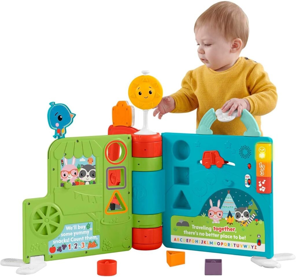 Le Grand livre d’activités montessori Fisher-Price est pensé pour accompagner votre enfant de 6 mois à 3 ans grâce à une plateforme 2-en-1 : d’abord grand livre à explorer assis, puis centre d’activités 360° pour se mettre debout et tourner autour. Trois niveaux de contenu progressif permettent d’aborder l’alphabet, les chiffres, les formes et les couleurs, avec 3 pages d’histoire et 8 activités ludiques (dont 3 formes à trier, une roue, un coulissant, une porte “coucou”, etc.). Les 3 boutons lumineux déclenchent 120+ chansons, sons et phrases pour soutenir l’attention sans surcharge : on privilégie des sessions courtes et répétées, dans l’esprit Montessori (du concret, puis le langage).