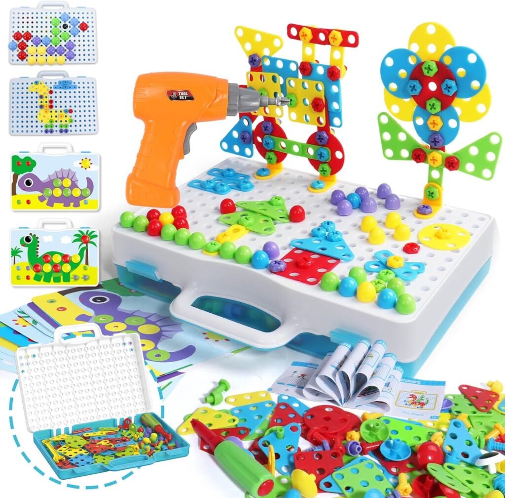 Les jeux éducatif montessori devient très avantageux, avec un bénéfice durable : un enfant fier, plus autonome et mieux concentré. La mosaïque de couleurs capte l’attention, le bruit réaliste de la perceuse amuse sans exciter, la boîte à mailles blanches sert à la fois de rangement et de tableau d’idées. Le résultat ? Un espace créatif nomade, robuste, sûr, et vraiment stimulant.