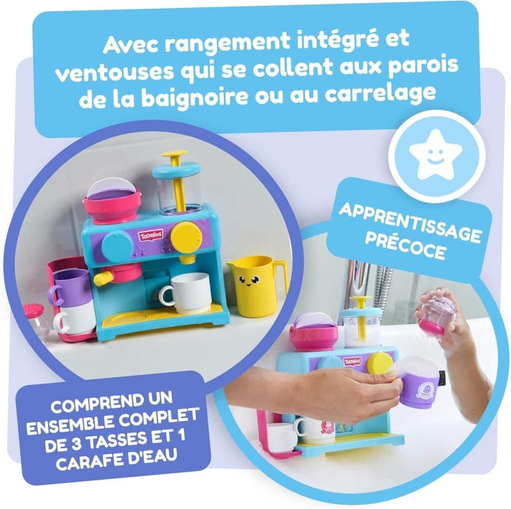 | Concept original de jouet de bain machine à café qui fait du bain un vrai jeu d’imitation | Demande quelques minutes d’installation au début pour bien fixer les ventouses |
