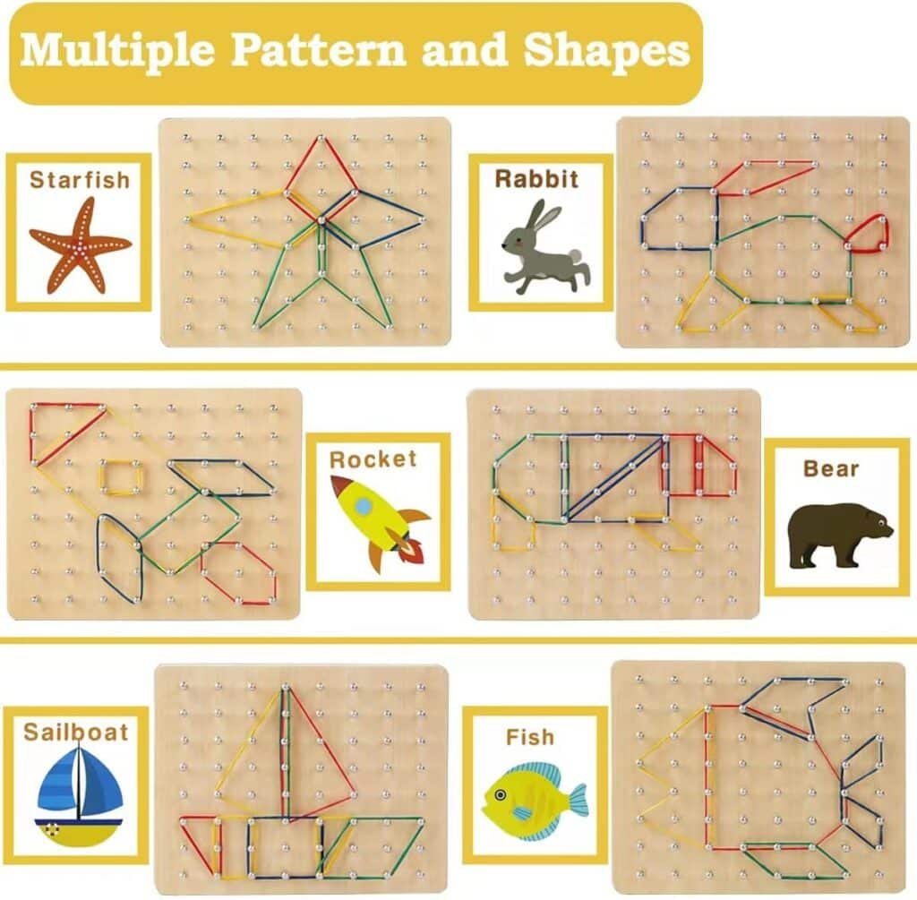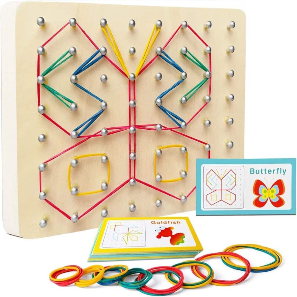Le jouet de motricité Montessori élastiques concentre l’essentiel de ce qui fait progresser : un geste clair (tendre, accrocher), un retour immédiat (la forme apparaît), une répétition courte et motivante. Votre enfant y gagne une main plus précise, une attention qui s’allonge, une confiance qui s’installe. Les maths y sont naturelles : on voit un angle, on trace un axe de symétrie, on partage un carré en fractions. La créativité n’a pas de plafond : des lettres aux mandalas, des maisons aux fleurs, le tableau devient canevas.