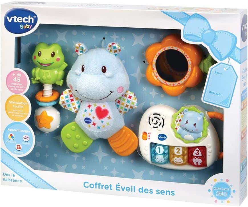 Offrir un jouet montessori coffret naissance éveil à un nouveau-né, c’est investir dans un démarrage apaisé, riche en découvertes et pensé pour l’autonomie. Dans cette version française, le coffret réunit les « essentiels » des premiers mois : doudou hippo ultra-doux et multi-textures (papier bruissant, broderies, rubans), pattes souples pour soulager les gencives, piano sons & lumières pour une stimulation douce de l’ouïe et de la motricité, miroir fleur pour la découverte de soi, et hochets (grenouille + koala électronique) pour développer préhension, coordination et curiosité.