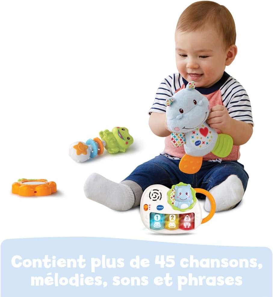 Coffret complet (doudou hippo, piano, miroir, hochets, cartes visuelles) | Rotation nécessaire pour éviter l’habituation |