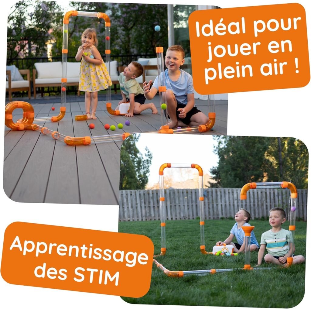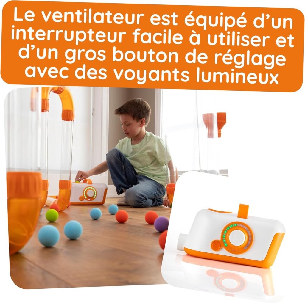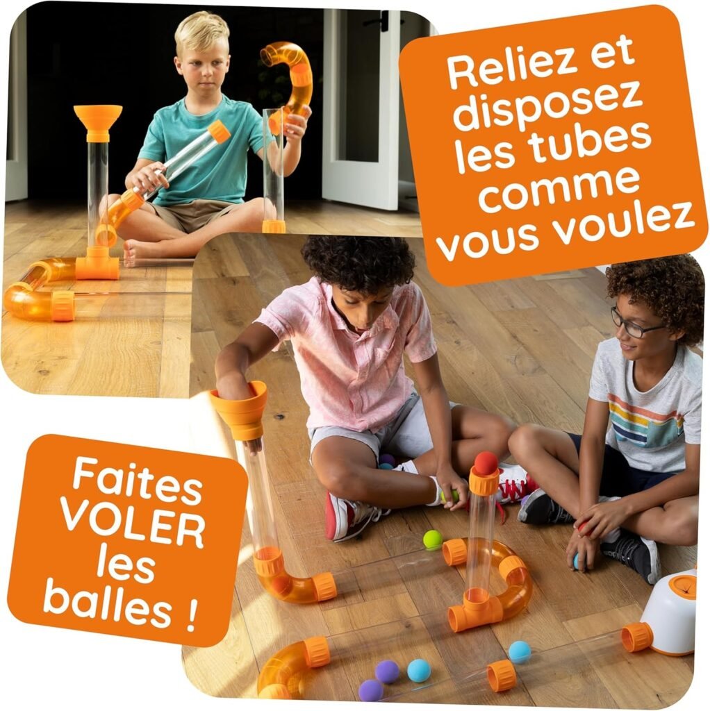 Vous cherchez une activité propre, fascinante et vraiment éducative pour un enfant dès 3 ans ? Le jouet scientifique à air comprimé (turbine + réseau de tubes modulaires) coche toutes les cases. Le principe est simple et bluffant : une petite turbine sécurisée propulse des balles en mousse à travers des tubes que votre enfant assemble à sa guise. Le résultat est immédiat : la balle décolle, ralentit, change de direction, réapparaît ailleurs et les questions fusent.
