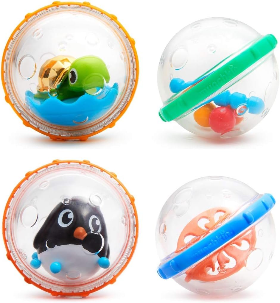 Les Jouets flotteurs de bain ne sont pas de simples accessoires pour amuser bébé. Ce lot ingénieux de quatre bulles flottantes deux avec figurines et deux avec mécanismes qui pivotent et cliquètent crée un mini laboratoire sensoriel dans la baignoire. Chaque bulle possède un anneau extérieur texturé qui tourne indépendamment, ce qui sollicite la pince pouce index, la coordination œil main et la curiosité. Résultat : votre enfant observe, manipule, écoute les petits cliquetis, suit des yeux la trajectoire des bulles et associe tout cela à un contexte apaisant : l’eau.