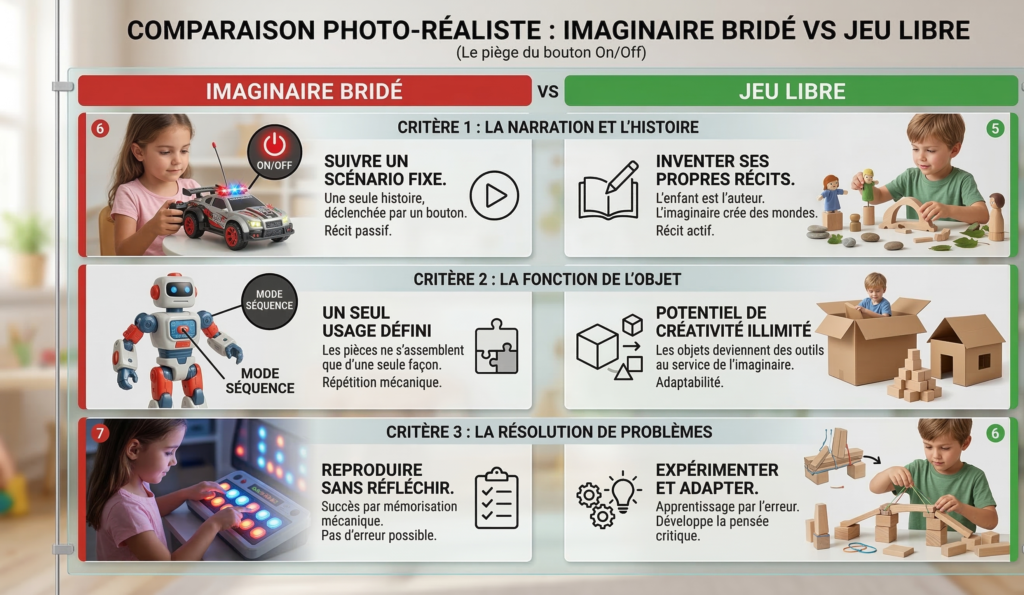 C’est la règle d’or de la pĂ©dagogie Montessori : « Plus le jouet en fait, moins l’enfant en fait. » Un chien en plastique qui aboie et marche tout seul fait 90% du travail. L’enfant n’a qu’Ă  appuyer sur un bouton et regarder. Ă€ l’inverse, un chien en bois ne fait aucun bruit et ne bouge pas. Pour qu’il prenne vie, c’est le cerveau de l’enfant qui doit travailler ! Il doit le faire avancer avec sa main, inventer son aboiement avec sa bouche et imaginer sa destination.