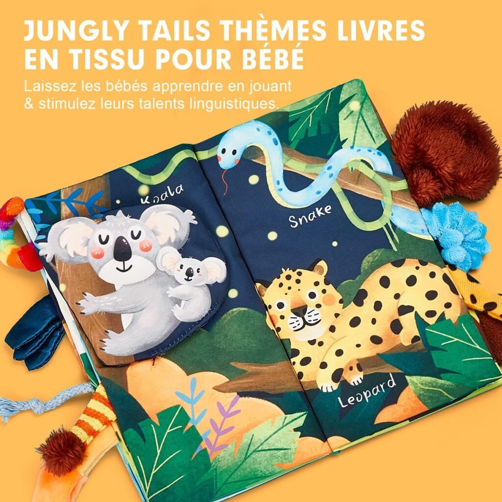 Le Livre des animaux montessori est un support d’éveil complet qui met la manipulation, l’observation et le langage au cœur des premiers apprentissages. Le modèle hahaland présenté ici cumule les atouts d’un livre d’éveil sensoriel moderne : tissu sans BPA, coutures robustes, pages froissées qui stimulent l’ouïe, couleurs vives pour ancrer la fixation visuelle et surtout des queues 3D (10 textures différentes) pour encourager le toucher fin. Chaque page illustre un animal de la jungle (koala, renard, girafe, éléphant, hérisson…), avec vocabulaire associé pour enrichir naturellement les échanges parent–enfant.