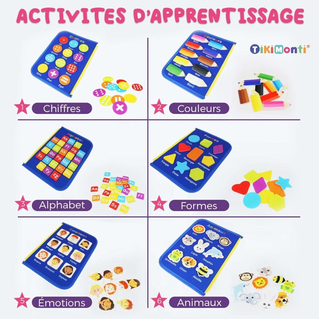 | Livre Ă©ducatif et sensoriel montessori 9-en-1 complet (formes, chiffres, couleurs, Ă©motions, animaux, lettres) | Ne fait pas âdu bruit et de la lumiĂšreâ comme certains jouets Ă©lectroniques (peut dĂ©cevoir un enfant trĂšs habituĂ© aux Ă©crans) |