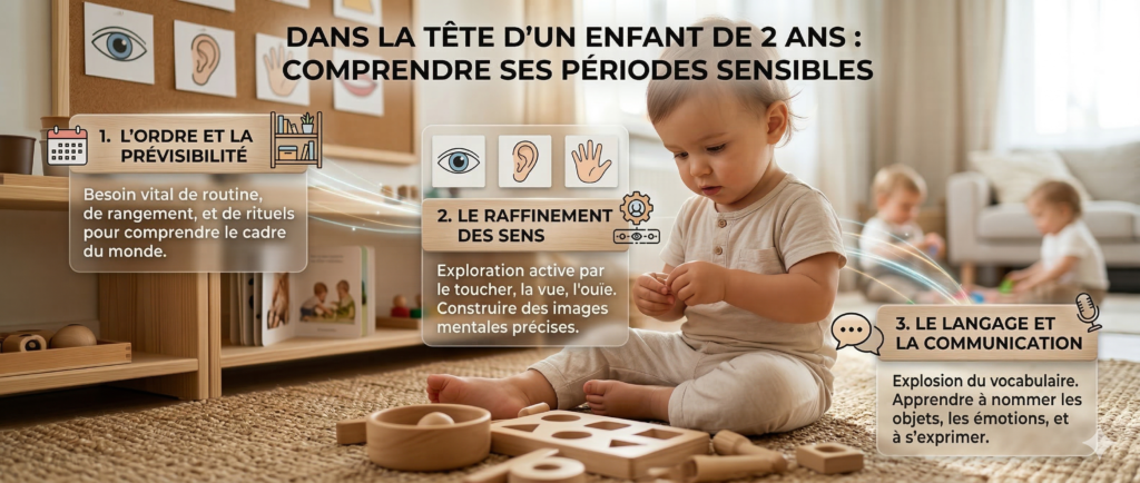 Maria Montessori expliquait que les enfants traversent des « pĂ©riodes sensibles », des fenĂȘtres de temps oĂč ils sont naturellement absorbĂ©s par un apprentissage spĂ©cifique. Ă 2 ans, le cerveau de votre enfant est programmĂ© pour trois choses : l’ordre, le raffinement du mouvement et le langage.
