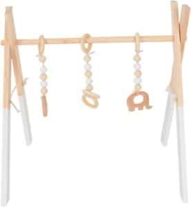 Les tapis avec arches amovibles offrent des jouets suspendus (anneaux, miroirs, hochets colorés).