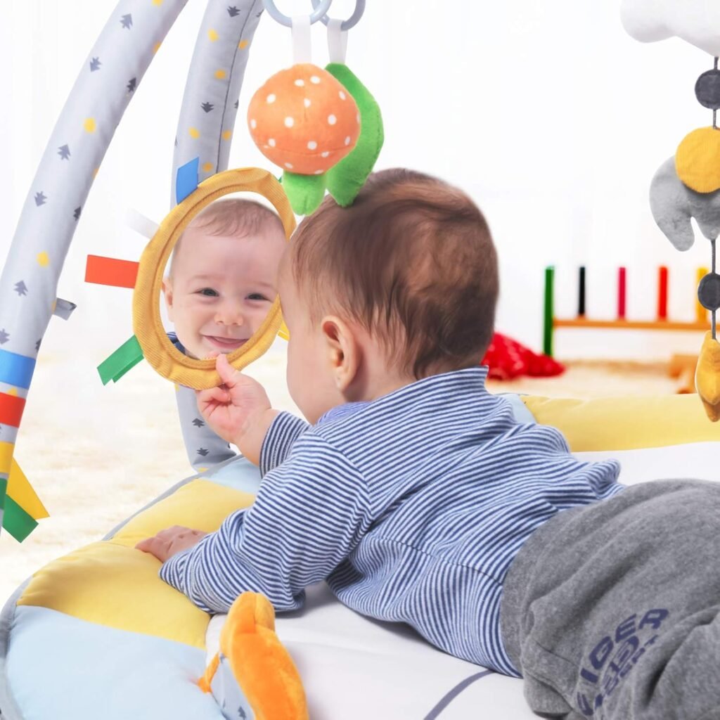 Il intègre 9 jouets d’éveil pour travailler la vision, l’audition, le toucher et la coordination œil–main : miroir sécurisé pour la découverte de soi, ours en peluche, oreilles de lion, feuilles et nuage “bruit papier”, 2 anneaux de dentition sans BPA, cartes contrastées, sans oublier la petite fosse à balles pour varier les manipulations.
