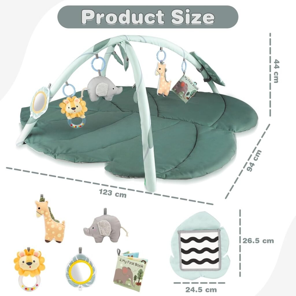 Sa surface généreuse (environ 123 × 94 × 44 cm avec l’arche) et son matelas épaissi et antidérapant créent un cocon confortable, tandis que l’arche d’éveil accueille 6 jouets sensoriels amovibles qui stimulent la vue, l’ouïe et le toucher : miroir de sécurité, cartes noir & blanc, hochet lion, girafe couineuse, éléphant textile sensoriel, livre en tissu. En bref : tout est réuni pour transformer chaque minute passée au sol en moment d’apprentissage utile.