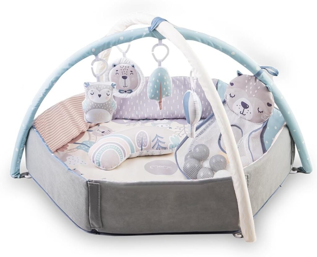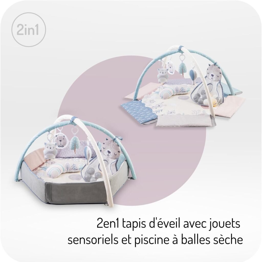 • Polyvalent : le tapis pour bĂ©bĂ© est livrĂ© avec deux draps suspendus pour jouets, 30 balles avec un sac de rangement en forme de chat endormi, 5 jouets et un coussin rampant en forme d’Ă©cureuil
