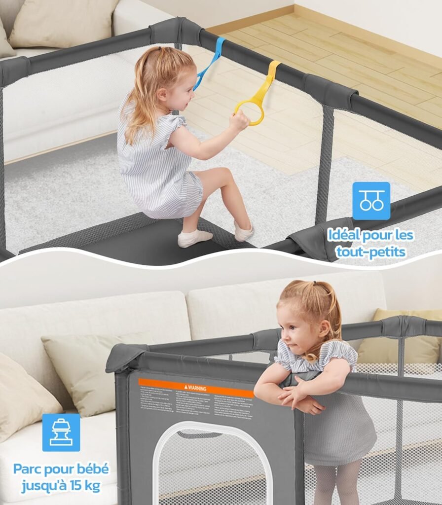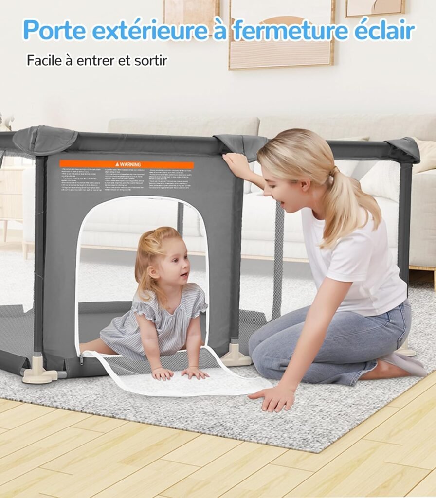 Pensé d’abord pour la sécurité, ce Tapis parc bébé bénéficie d’accessoires mis à jour : coins anti-collision de nouvelle génération, connecteurs renforcés qui supportent mieux les contraintes, base stable qui augmente la résistance au frottement au sol. La fermeture éclair des portes est placée à l’intérieur pour que l’enfant ne puisse pas l’ouvrir seul, ce qui renforce la sécurité tout en rendant l’accès facile pour vous.Le montage ne demande aucun outil : l’assemblage/démontage prend quelques minutes, idéal si vous réorganisez l’espace régulièrement. Bonus utile : le Tapis parc bébé se plie et s’emporte facilement, ce qui en fait un vrai compagnon pour les familles qui bougent (week-ends, vacances).
